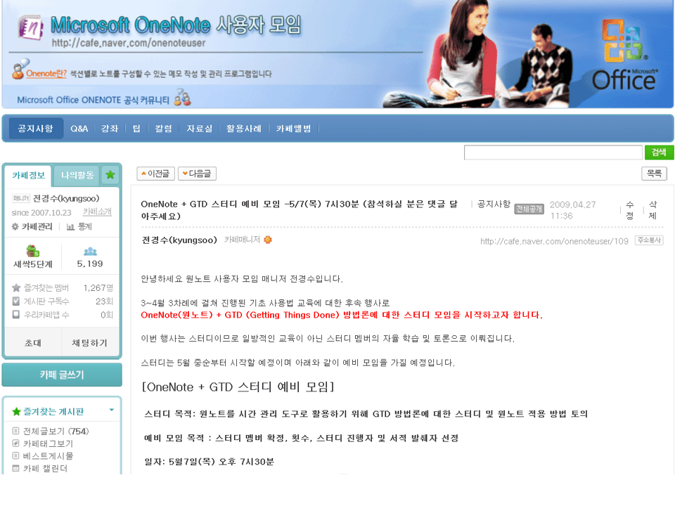이렇게 1년에 한차례 미국을 방문하여 견문을 넓히고 원노트란 제품에 대한 강의를 하던 중 네이버에 “원노트 사용자 모임”이란 카페를 개설하여 운영하고 계시던 1대 매니저인 박 찬 MVP 님으로부터 2대 매니저 제안을 받게 되었습니다. 매니저가 된 저는 원노트의 기능과 업무 프로세스를 결합하는 차원의 스터디를 기획하게 되었고 몇 번의 GTD 스터디를 진행 한 후 마침내 2009년 4월 7일 GTD와 Outlook을 접목한 “Take back your life”란 책을 토대로 본격적인 스터디 및 아웃룩+원노트+GTD 과정의 이론적인 토대를 쌓게 됩니다.